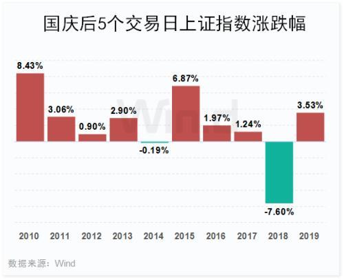 而国庆节后一周(节后5个交易日),大盘表现是8年上涨,2年下跌,具体涨幅分别为8.43%、3.06%、0.90%、2.90%、-0.19%、6.87%、1.97%、1.24%、-7.60%、3.53%。