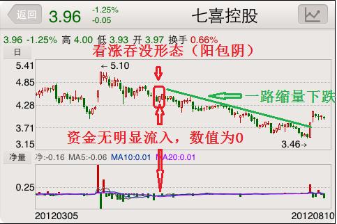 七喜控股(002027)2012年5月15日虽然产生了经典的看涨吞没形态(阳包阴)形态,但后期出现了破位大跌,最大跌幅达到23.11%。(图八)