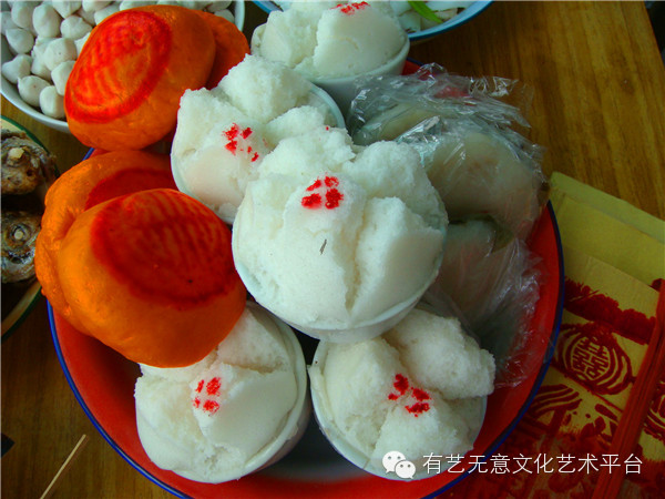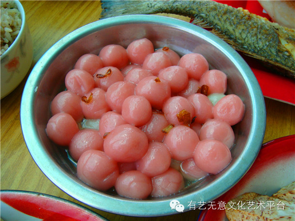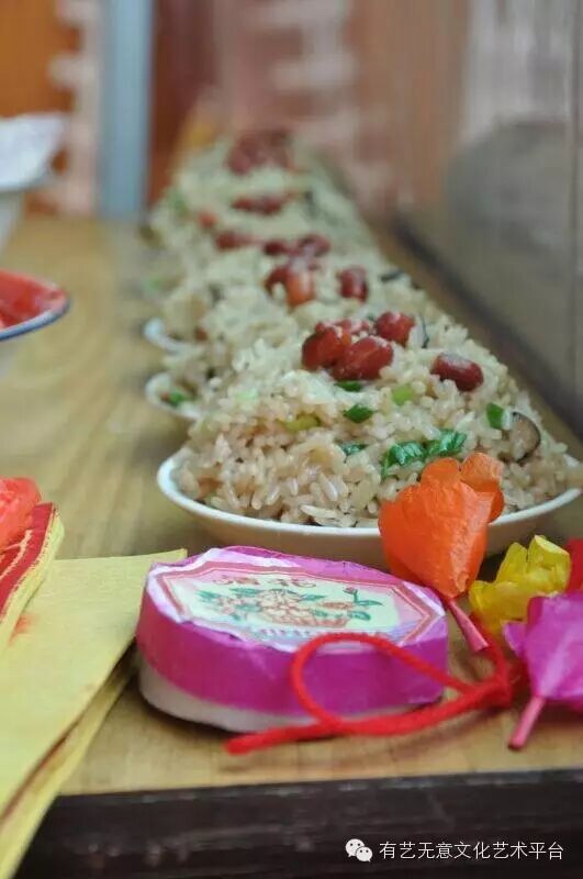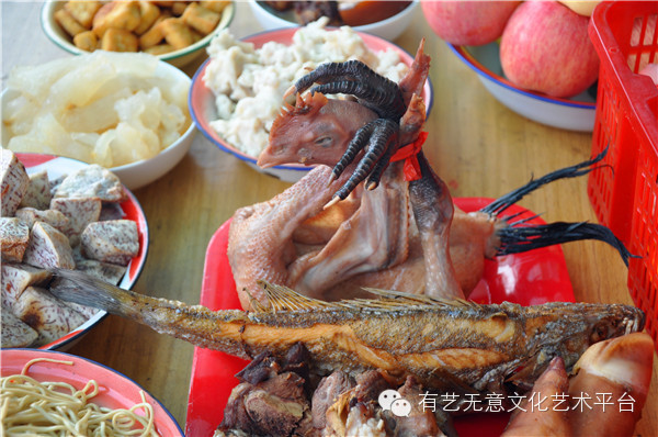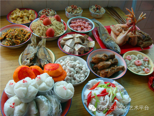 其余陈列的果蔬、糖果(煮熟的甜糯米丸)、酒樽、箸筷子,