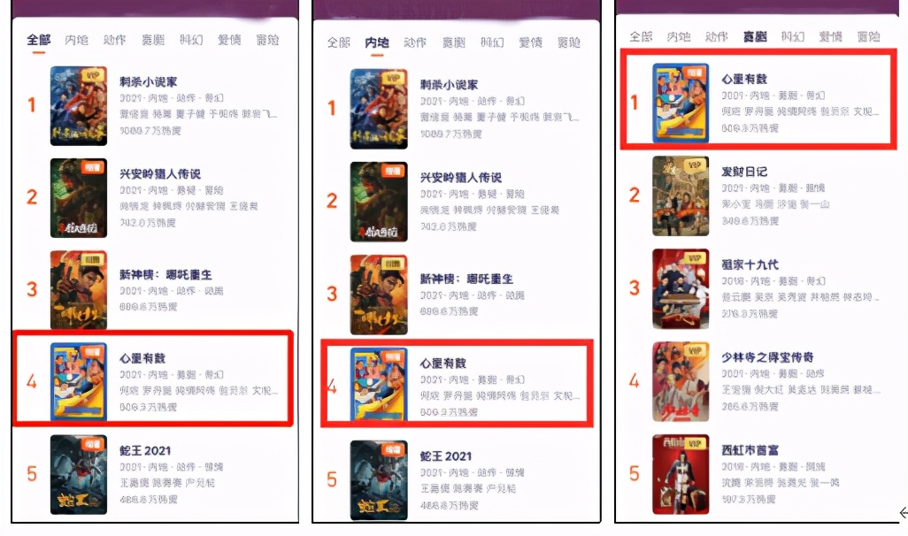 《心里有数》在电影总榜、内地榜、喜剧榜的排名截图。