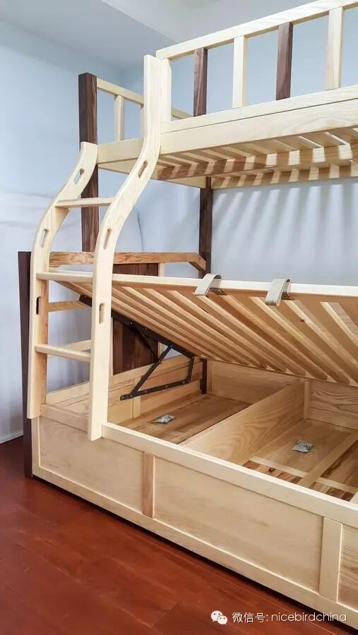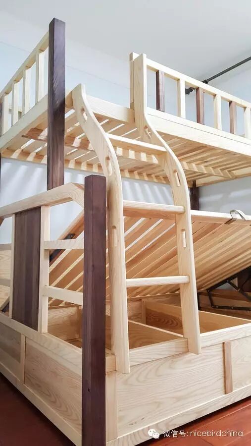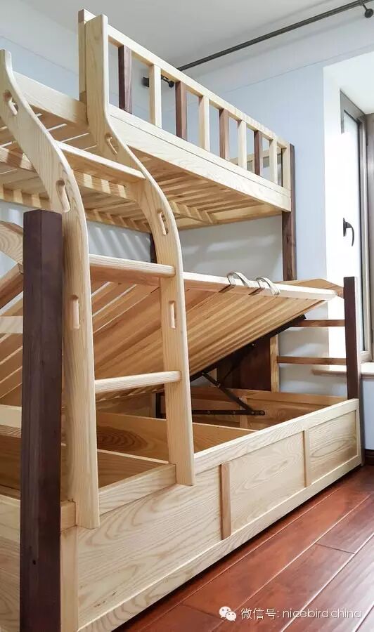 上下床通过榫卯结合,非常结实可靠和安全。需要变化时,这个床很方便上下拆分,一床变两床,更灵活更实用。挡板楼梯等都是榫卯结构可拆卸的,轻松拆掉做为单床时非必要的部分。