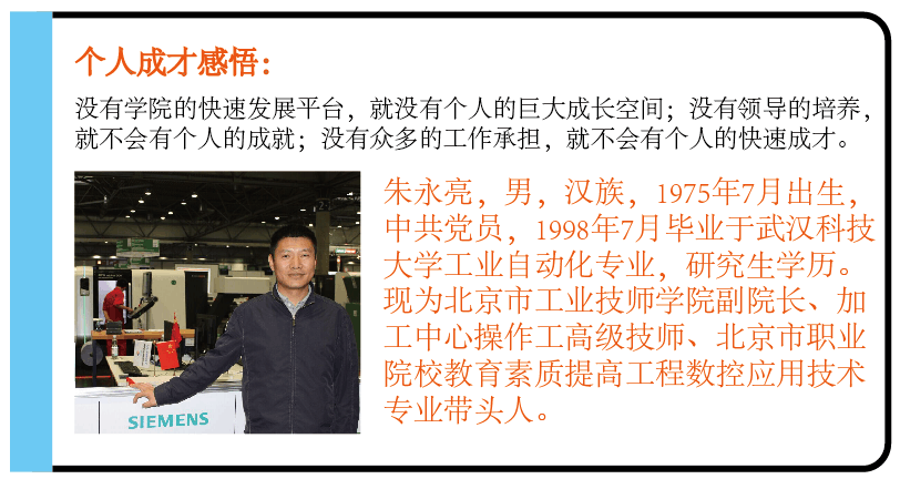 朱永亮的努力没有白费,北京市工业技师学院4大专业中有7名课程负责人,朱永亮负责的数控专业就占了3个,全系一体化教师达到60%以上。