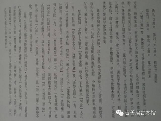 故宫博物院这批藏琴,有唐宋元时期具有典型特点的重器,这是构成故宫古琴的独特之点。想要把各时代所缺补充齐全,事实是做不到的。希望保管古琴之士及时呵护之,勿与无机质文物同等对待,俾传世有限的名琴永不腐朽。---郑珉中