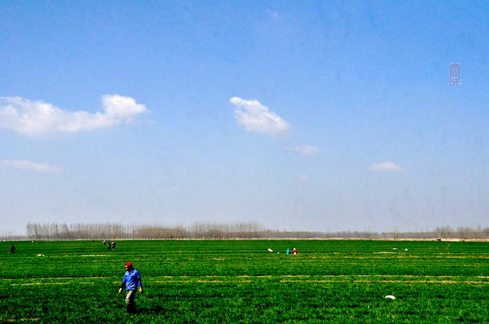 在这里,我感受到了蓝天白云下无际沃野的美丽。“九曲黄河万里沙,浪淘风簸自天涯。” 作为中华民族母亲河的黄河,万里奔波裹挟积聚的泥沙,为沿途尤其是下游两岸冲击而成了大片肥沃土地,以此养育了中华大地世世代代的勤劳子女。特别是新中国成立以来,黄河已经彻底告别了对沿岸人民的危害,反倒是附近农民大受其益,广阔肥厚的土地加上取之不尽的河水,为当地的农业生产提供了天然便利。这里,见不到一座山岗甚至一块石头,也见不到一片荒芜的贫地,有的就是一马平川的百里沃野,还有我们在城里已经很难寻觅到的瓦蓝的天、白白的云,再加上脚下那一片碧绿一望无际的麦田之衬托,好一副优美的乡野画卷!让人不禁产生出”如今直上银河去,同到牵牛织女家“的幻觉。