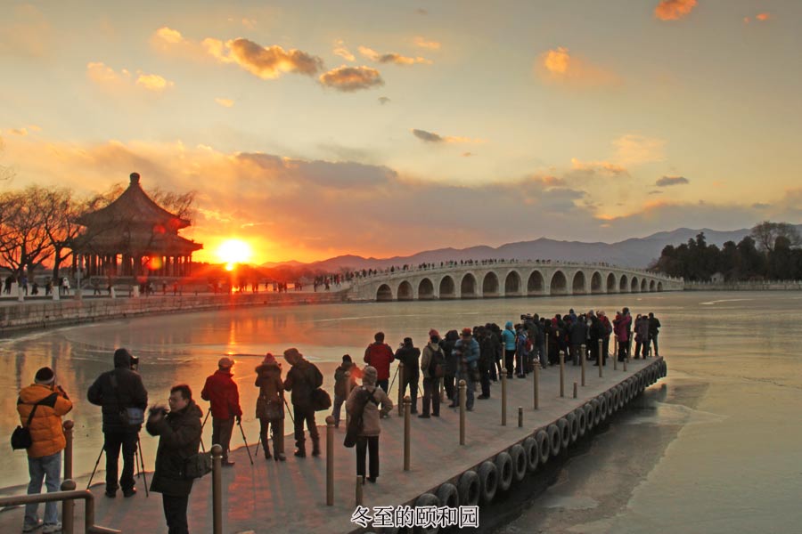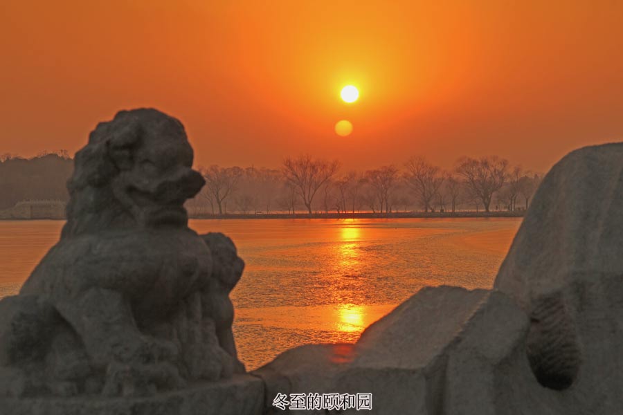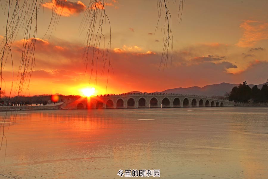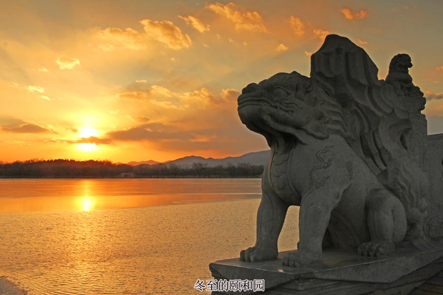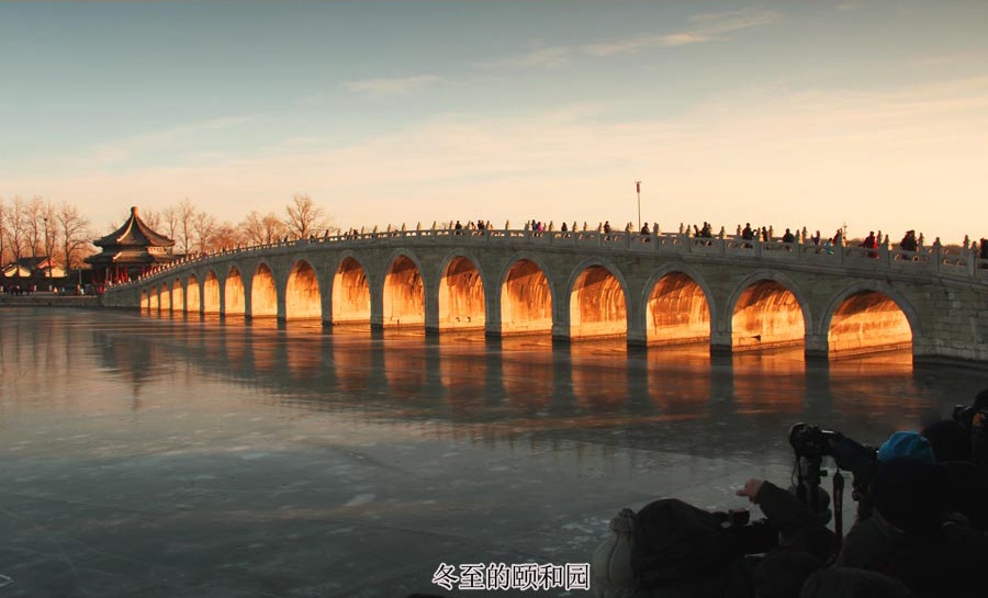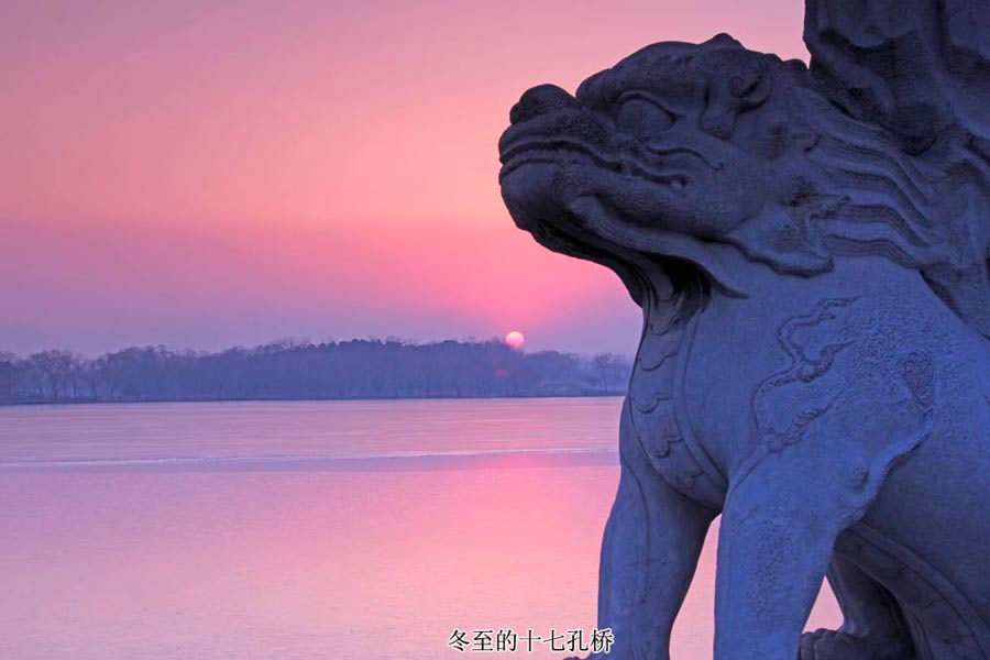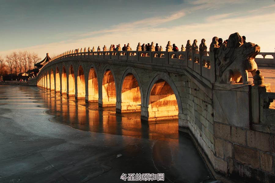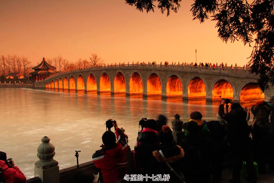 P2:桥的南端横联上刻有乾隆题字“修虫柬 凌波”五个字,形容十七孔桥如同一道彩虹,飞架于昆明湖碧波之上。冬至夕阳,是乾隆题词的最好体现。