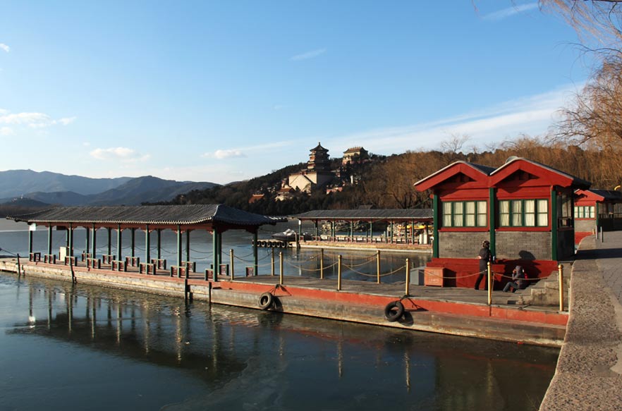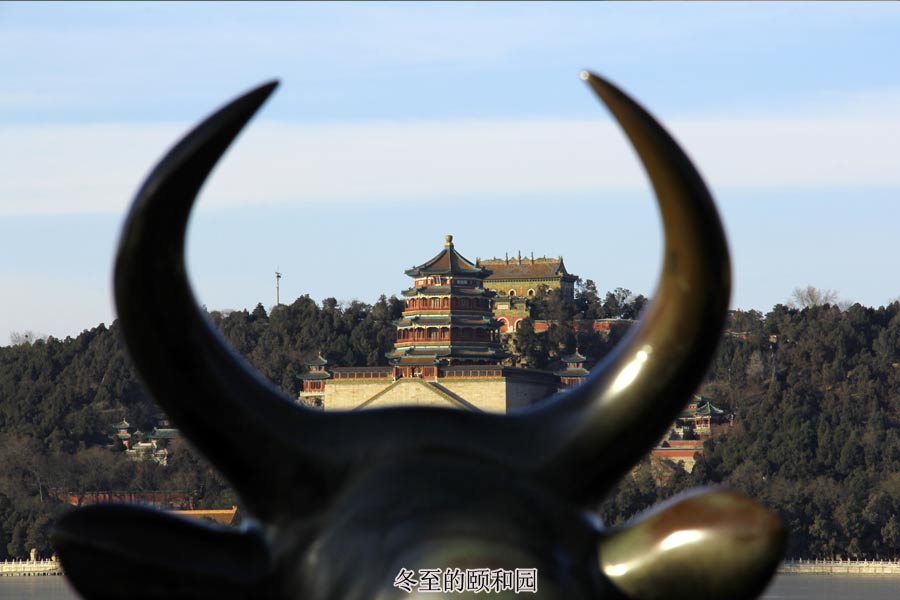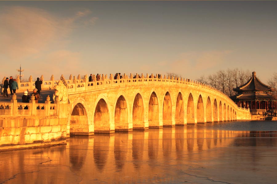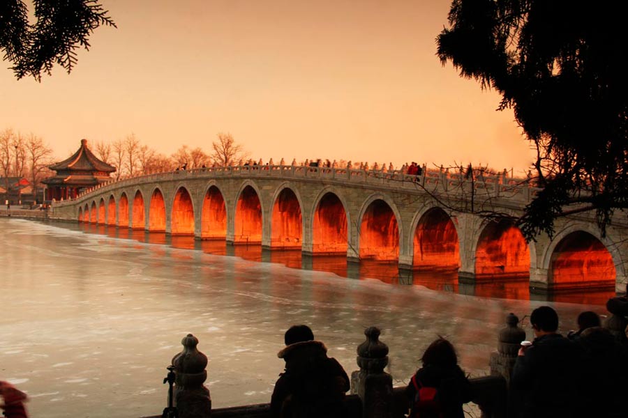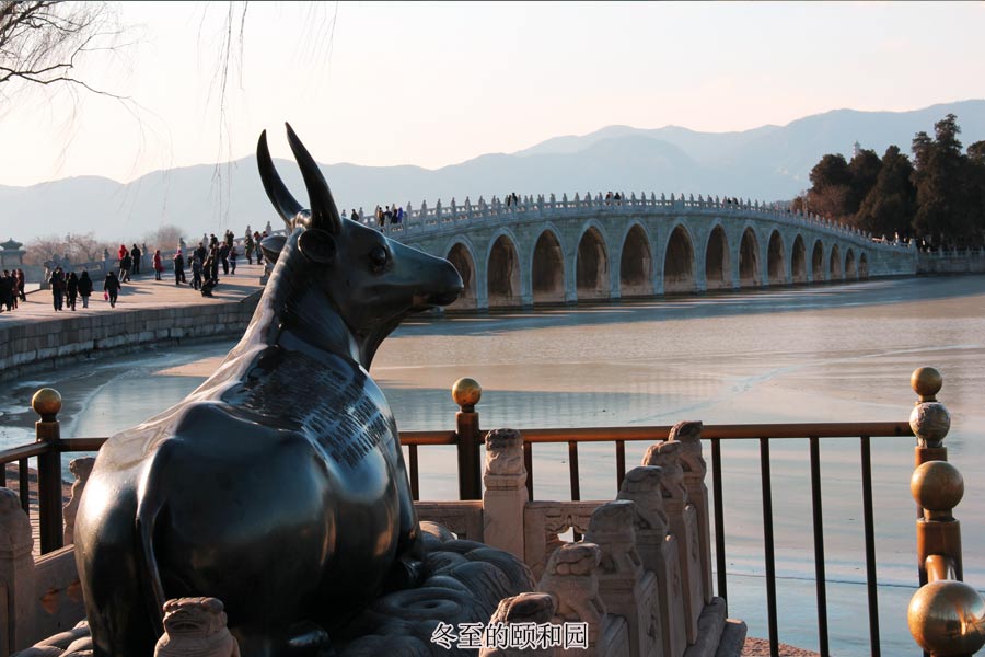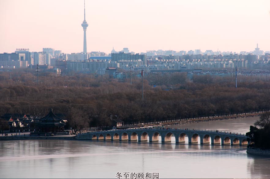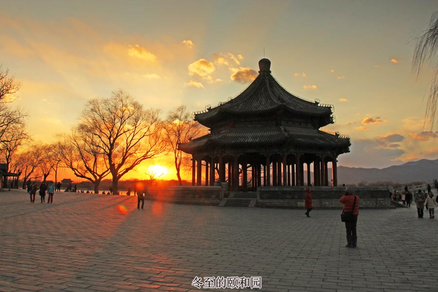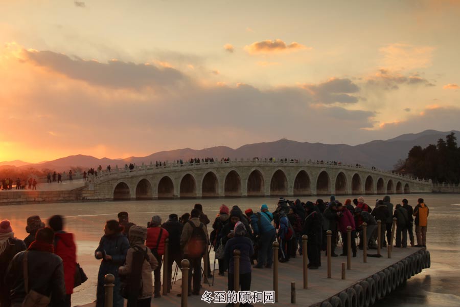 P2:桥的南端横联上刻有乾隆题字“修虫柬 凌波”五个字,形容十七孔桥如同一道彩虹,飞架于昆明湖碧波之上。冬至夕阳,是乾隆题词的最好体现。