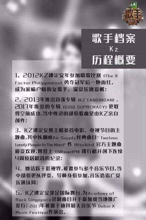 在首发歌手基本走光了的同时,本期迎来了又一位国外歌手,菲律宾女歌手—KZ谭定安