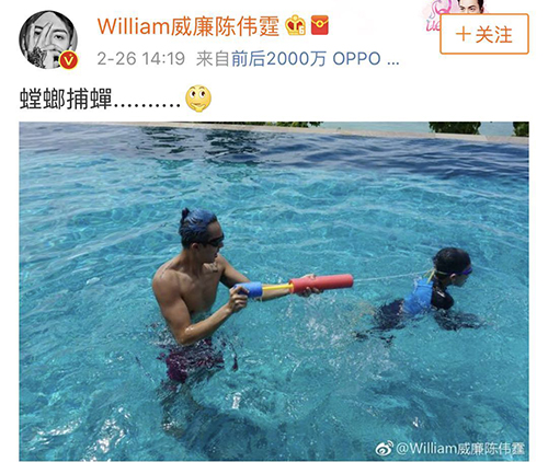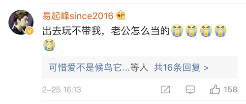 对于以上二位网友小编只能说“孩子,春节过了,春晚也结束了,咱们的戏是不是稍微多了一点儿?”相比李易峰度假的“孤家寡人”,陈伟霆出门度假显然更让人“羡慕、嫉妒、我也想去”,因为他竟然带上了全家组团出门度假。