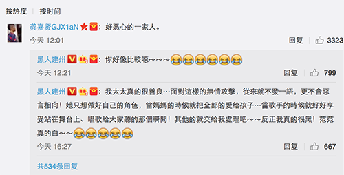 对于老婆频频被网友无端辱骂,范玮琪的老公黑人陈建州坐不住了,现身怒怼网友。有网友在陈建州微博下留言“好恶的一家人”,陈建州diss网友“你好像比较恶!”还有网友评论“不要在炒作了,如果觉得被污蔑,就说清楚事实啊,不要在每天拿孩子当挡箭牌。微博发的这么频繁,不被骂都拿。”而陈建州则回复“我太太真的很善良⋯面对这样的无情攻击,从来就不发一语,更不会恶言相向!她只想做好自己的角色,当妈妈的时候就把全部的爱给孩子⋯当歌手的时候就好好享受站在舞台上、唱歌给大家听的那个瞬间!其他的就交给我处理吧~~反正我真的很黑!范范真的白~”