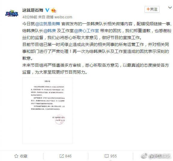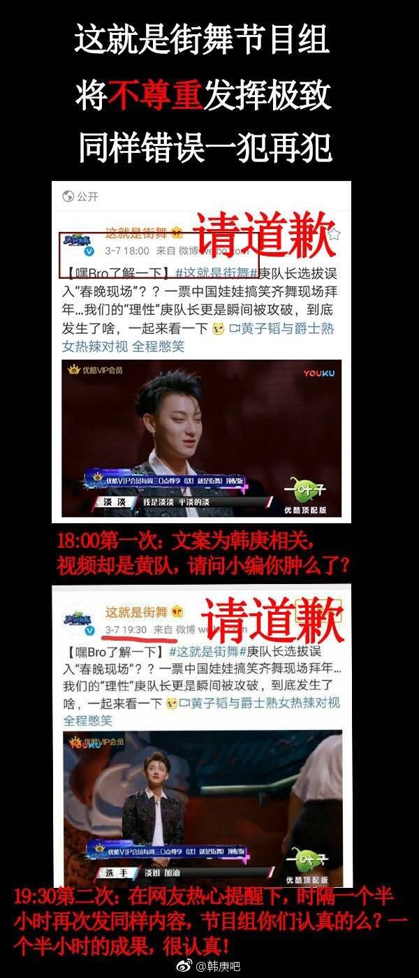 原来是3月7日,综艺节目《这,就是街舞》在官博发布了一条韩庚的相关内容,谁知道却错配成了黄子韬的视频。
