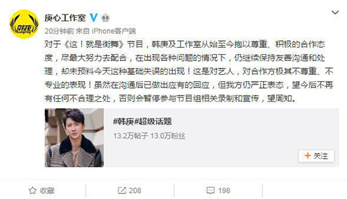 韩庚粉丝纷纷留言“韩庚和庚饭一直用最大的诚意对待节目,希望得到应有的尊重!!!”还有网友表示“我服了?这节目一直都这么不走心???”