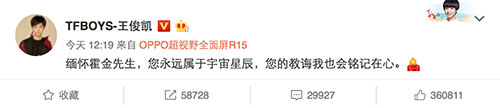 王俊凯:缅怀霍金先生,您永远属于宇宙星辰,您的教诲我也会铭记在心。