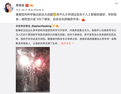 还有网友发文“霍金去世了,王俊凯李冰冰等众星缅怀霍金:您永远属于宇宙星辰