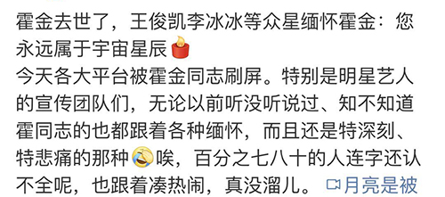 今天各大平台被霍金同志刷屏。特别是明星艺人的宣传团队们,无论以前听没听说过、知不知道霍同志的也都跟着各种缅怀,而且还是特深刻、特悲痛的那,唉,百分之七八十的人连字还认不全呢,也跟着凑热闹,真没溜儿。 ”