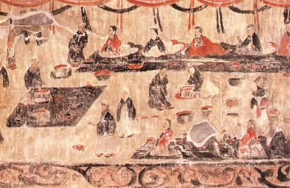 再说“宴”。从大风歌起到曲水流觞,从沛县县令的欢迎宴到千古鸿门宴,从田蚡的婚宴到中山王夫妇的游猎宴,从钟鸣鼎食到俳优百戏,从雅歌投壶到六博棋局……论及礼制习俗,从“百礼之会”到“客彻重席”,从宴会座次到饮食有仪,从秦汉席地而坐、一人一案的分餐到唐代中晚期垂足而坐、围坐一处的合食……宴饮的意义远在饮食之外。