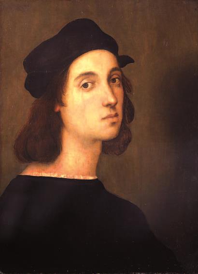 意大利乌菲齐美术馆收藏的这幅自画像与《雅典学院》中的拉斐尔形象十分相似,被认定为拉斐尔23岁左右的自画像。在这幅半身像中,拉斐尔披着一头栗色的齐肩长发,这是典型的文艺复兴宫廷风格。他头戴一顶黑色帽子,身着黑色长袍,脸上流露出专注、忧郁的神情。这幅画可能是拉斐尔送给蒙特费尔特罗宫廷的礼物,1632年被美第奇家族收入囊中。画面中拉斐尔优雅的容貌证实了瓦萨里在《艺苑名人传》中对这位天才画家的热情赞扬:“优雅、博学、美丽、谦逊,是艺术家‘完美形象’的表现者。”