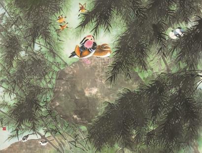 1980年后,陈佩秋将墨上加彩的技法运用到花鸟画创作中,通过运用“落墨为格,杂彩副之”的落墨之法来强调光影效果。落墨法的实践,极大地拓展了陈佩秋运用光影手法表现山水、花鸟的空间,色彩也得以在绿色调的基础上变得愈加丰富多样,画面愈发厚重。比如,20世纪80年代初所作的《杨柳鹭鸶》、1982年所作的《柳荫飞禽》,都属此种类型的全景花鸟画杰作。