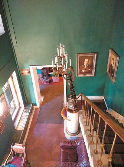 咖啡馆的二楼是主厅,装潢风格典雅华丽,保留着19世纪30年代的法国风貌:绛红色的大厅,墨绿色竖灯灯罩,法国古典式家具,墙上挂满了各种名人油画,大厅当中一架黑色的三角钢琴尤为引人注目。记得2014年去的时候,我们专门挑了个靠窗的座位,那是普希金生前最喜欢的窗口,推窗望去,清澈的莫伊卡河近在眼前,喧闹的涅瓦大街上人流不断。弹琴的大叔判断我们来自中国,立马奏起了一首《茉莉花》,听得我们眉开眼笑。