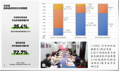 1.《2022抖音知识数据报告》部分内容 2.较少阅读纸质书者相关描述统计结果图3.《短视频时代的阅读研究》报告发布及研讨会