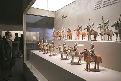 目前,由中共中央宣传部、国家文化和旅游部、国家文物局主办的“鉴往知远——新时代考古成果展”在中国国家博物馆举行。本次展览以2012年以来的全国十大考古新发现为重点,系统汇集展示全国43家文博考古机构近400件最新考古出土文物,以“走向文明”“协和万邦”“海宇攸同”“殊方共享”四个部分,生动讲述中国境内人类起源、文明起源、中华文明形成、统一多民族国家建立和发展的历程。图为观众参观陕西西安少陵原十六国大墓出土的骑马吹角俑和骑马击鼓俑。