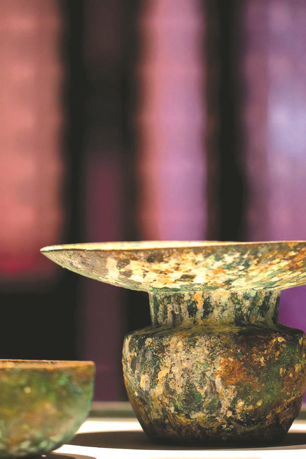此次展览的明星展品之一——出土于法门寺地宫的鎏金银茶器,由唐僖宗施供给法门寺。茶具以錾刻或浮雕的飞鸿、摩羯鱼、莲瓣等佛教艺术中常见的题材装饰,器物通体为银色,纹饰处鎏金,金与银交相辉映,形成极佳的视觉效果。茶具套装中的玻璃托盏通体碧绿、如水晶般剔透晶莹,茶汤注入其中有如“回潭曲渚青萍之始生”,使饮茶不仅仅停留在味觉享受的层面。这件托盏很可能是萨珊波斯的工匠应中国买家的要求定制的,是当时的顶级奢侈品。
