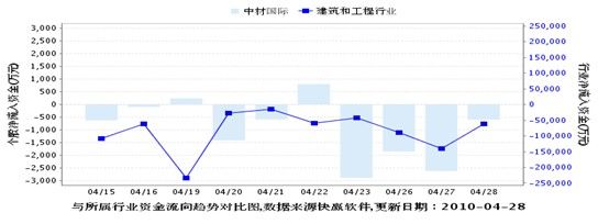 中材国际(600970)资金流向2010-04-28当日净流入:-596.43(万元) 占成交额比:9.59%,5 日净流入:-7134.03(万元) 占成交额比:11.9%,20日净流入:-7804.43(万元) 占成交额比:2.44%,0日净流入:-8604.56(万元) 占成交额比:2.02%,建筑和工程行业资金流向当日净流入:-61925.43(万元) 占成交额比:14.11%,5 日净流入:-388769.13(万元) 占成交额比:13.12% ,0日净流入:-12元) 占成交额比:5.97%