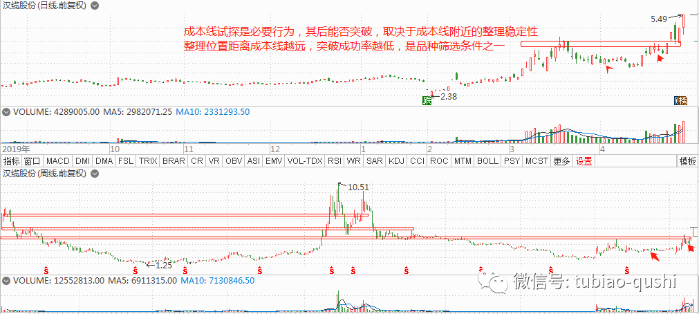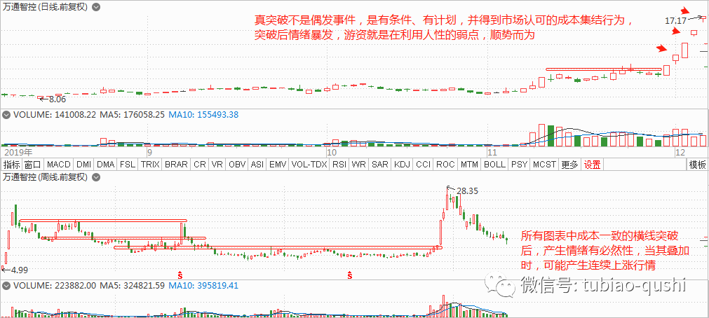 所有主动出击的品种,其图表上都会有一条情绪线,情绪线的产生基于最基础的成本分布,巧合的现象是它们的成本都能用一根很清晰的横线来描述,即长时间的震荡整理使其成本变得集中且一致,一旦突破,基于不变的人性,多数人的反应是相同的,情绪随之而来,万通、汉缆成本及情绪图示: