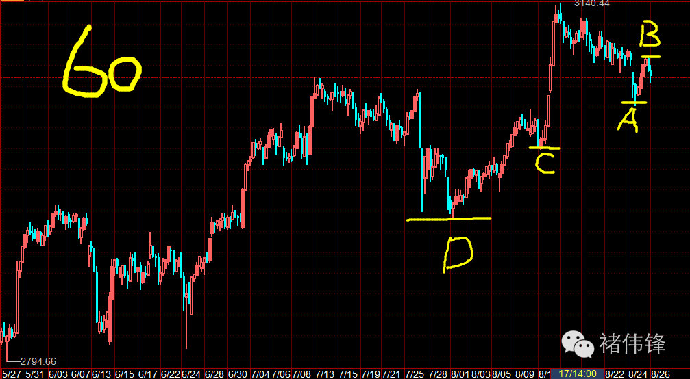 目前明显的60分钟做了个反抽B点,后面A点破位,60分钟上升终结。C点破了,60分钟下降趋势,D点破了是日线级别。