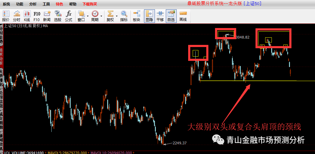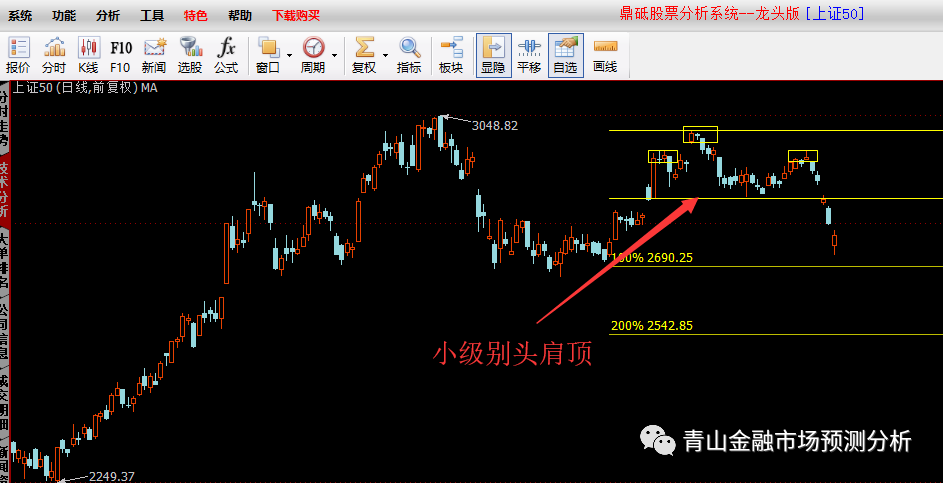 更大的级别上证50指数形成了一个双头或是复合头肩顶的形态,前低为颈线,这里就是非常重要的分界。颈线位置一定会有抵抗,破坏掉市场中会再重复前段的走势。