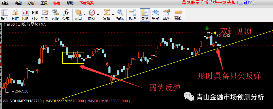市场上调呈触底反弹状态,上证50指数在双针形成短期高点寂寞青山:上证50权重新高之后,于上周横盘震荡反弹,由于其在周末的反弹最低点击破了周中的低点,所以反弹虽有但是会呈弱,类似7月旬的震荡反弹形态。