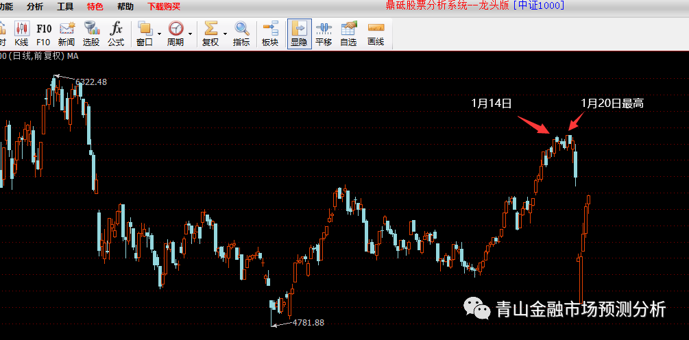 如何应对差异化市场?比如去年这波反弹中,我们原预计市场将在未来时窗指示的时间1月20日(误差一天)见顶,但我们坐持续做多改为减仓策略是1月14日。这个时间在未来时窗里并没有,这一天也成为上证指数最高点,不过,让我们来看本波主要的反弹动力中证1000指数,却看到其最高点在1月20日形成!与1月14日成为双顶。