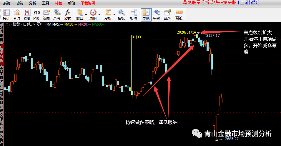 现在我们已经知道历史的进程,那么假如回到1月14日的时候,做什么样的策略最佳呢?“因为差异化的存在,1月20日还有一个指数的高点,不过弱势个股早已开跌。那么最佳的策略就是1月14日要知道风险已经来临要减仓,但是由于个股不同,有一些个股还没有炒尽兴,所以要根据手中个股来最佳,这样个股才有可能卖到最高点。”这也是当时我们的策略,即便知道了未来我们不会得出更好的策略,因为这本来就是最佳的。