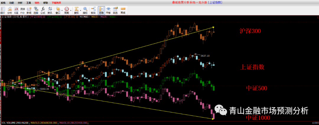 对于市场的分化现象,我们最早在2016年就进行过分析,在很早的时候,我们就将沪深300、创业板指数、上证指数、中证1000指数单独拿出来分析,因为很多交易者基本只会看上证指数,所以在这种分化的行情中很吃亏。我们将这种市场叫做,分化的大型震荡市,就是非牛非熊,亦有牛有熊。腰斩和翻倍同在,这就要求我们不仅去观察上证指数,还要对主要影响涨跌的因素进行分类分析,当前很重要的就是市值因素。如下图所示,我们可以看到,沪深300指数、上证指数、中证500指数、中证1000指数明显的走势区别。