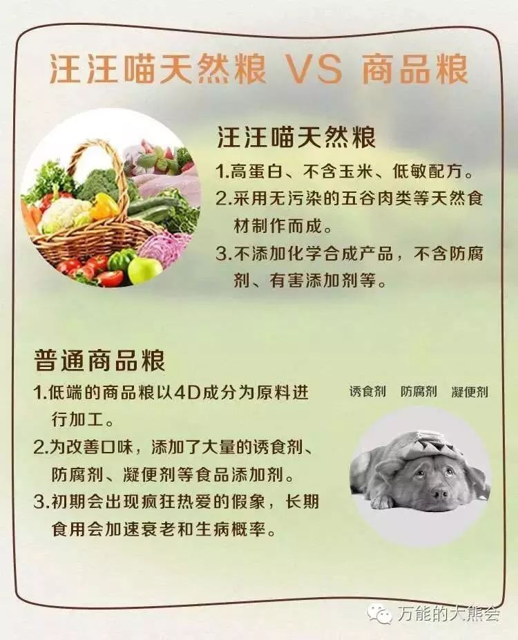 天然粮则以天然产品为原料,不添加诱食剂、凝便剂等物质,营养更均衡养,对狗的营养吸收及对肌肉、骨骼、皮毛都有很好的效果。我们的产品当然是选择做天然粮。