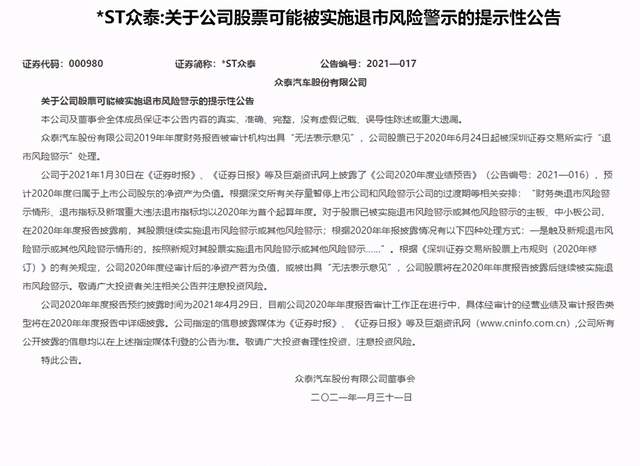 1月31日晚,*ST众泰发布《关于公司股票可能被实施退市风险警示的提示性公告》。*ST众泰指出,该公司于此前披露了《公司2020年度业绩预告》,预计2020年度归属于上市公司股东的净资产为负值。根据深交所有关存量暂停上市公司和风险警示公司的过渡期等相关安排:“财务类退市风险警示情形、退市指标及新增重大违法退市指标均以2020年为首个起算年度。对于股票已被实施退市风险警示或其他风险警示的主板、中小板公司,在2020年年度报告披露前,其股票继续实施退市风险警示或其他风险警示。