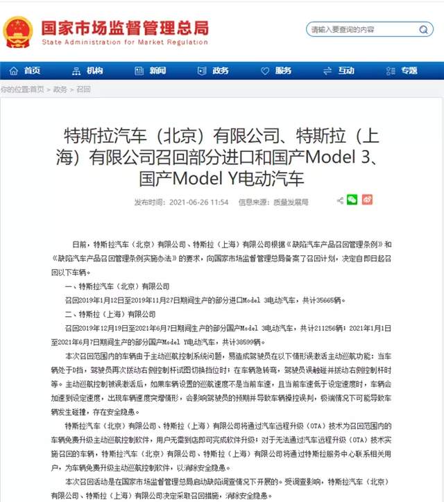 2021年6月的最后一个周末被特斯拉搅起波澜!26日午间,据国家市场监管总局网站消息,特斯拉汽车(北京)有限公司、特斯拉(上海)有限公司向国家市场监督管理总局备案了召回计划,决定自即日起召回以下部分车辆: