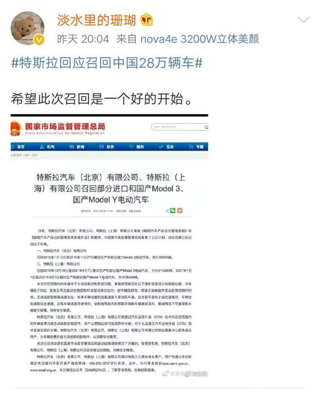 在特斯拉客户支持发布公告后,曾在上海车展维权的女车主在社交平台发声:希望此次召回是一个好的开始。据了解,该车主此前维权的Model 3也在召回范围之内。