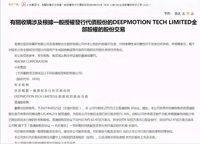 8月25日晚,小米集团发布公告称,公司与Deepmotion Tech Limited(深动科技,自动驾驶技术公司)相关订约方订立股份购买协议,据此,公司有条件同意收购而各普通股股东卖方及各优先股股东卖方有条件同意出售1.25亿股普通股及5085.47万股优先股,分别为Deepmotion已发行股本的71.16%及28.84%。整体收购总代价约为7737万美元,花掉了小米十年计划投资中的不到1%。
