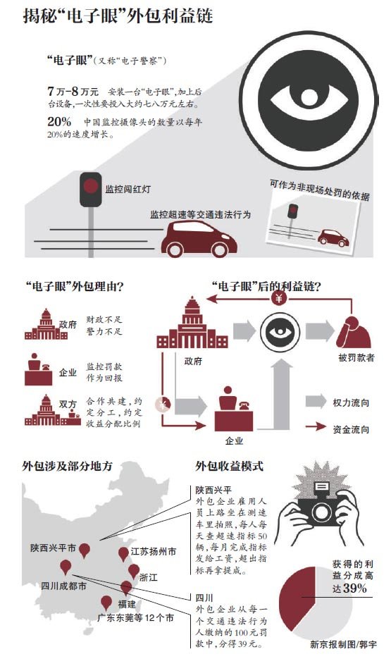 ——新京报报道,近年来四川、广东、福建、浙江、江苏、陕西等多地推行了电子眼“外包收益”模式,以成都为例,引进私营企业“四川浩特”出资安装电子眼系统,并以“取证成本”的名义,从司机所缴罚款中分得39%的利益,企业方每年获益数千万元!