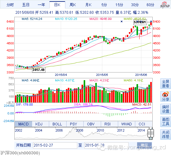 今天来论市是因为随着沪深300指数5370多点之后,尤其是周一盘面出现强烈的分化走势,使得很多投资者深感困惑和不安,因为之前我已经写过分析,一个月之内沪深300指数会挑战07年高点,虽然我不知道是这样每天几百点之后去挑战,还是进过不断的反复再去挑战,但我可以清晰地告诉各位关注【股市公交车】微信号:yangsheng_zd的投资者,就目前沪深300指数的技术走势来看很流畅,没有必要自己吓自己,相对来说技术面在一定时间内是具有自己的定律和运行趋势,在没有外力干预下,一般会沿着趋势发展,我们从沪深300指数日线MACD走势来看吧!