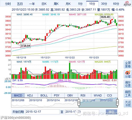 如果仅从技术走势来分析,我们认为中线走势依然很健康,只是短线技术上有修复调整偏高的技术指标要求,这从分时图15分钟来看,周四不排除沪深300指数进一步考验60天均线3849线一带支撑,但近期沪深300指数依然会去冲关225天年线3956压制,并在跨越2016年之际迎来新的上升行情,因为目前A股的基本面暖意融融。