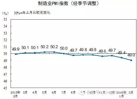 据统计局网站1日消息,2016年2月份,中国制造业采购经理指数(PMI)为49.0%,低于上月0.4个百分点,连续七个月低于荣枯分界线。这一数据创出了2011年11月以来4年多最低水平。