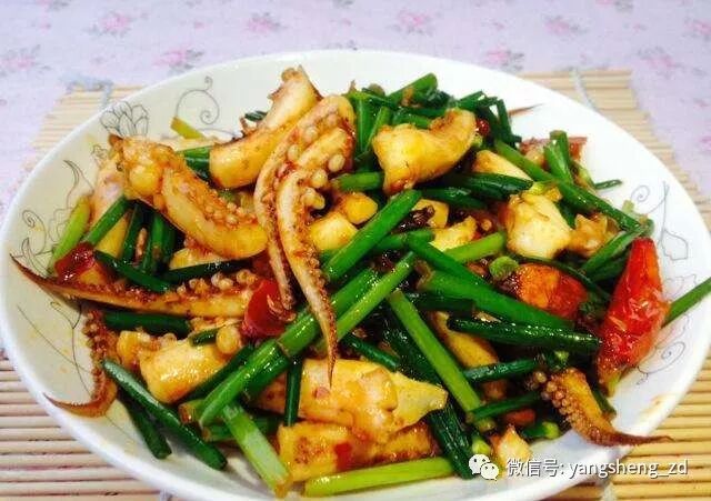 尤其是鱿鱼富含钙、磷、铁元素,利于骨骼发育和造血,能有效治疗贫血。含有的多肽和硒等微量元素有抗病毒防辐射的作用,能够预防带血综合症,降低血液中的胆固醇,缓解疲劳,恢复视力。而韭菜苔就是韭菜的嫩茎不但口感鲜嫩诱人,它的保健功效也很出色。