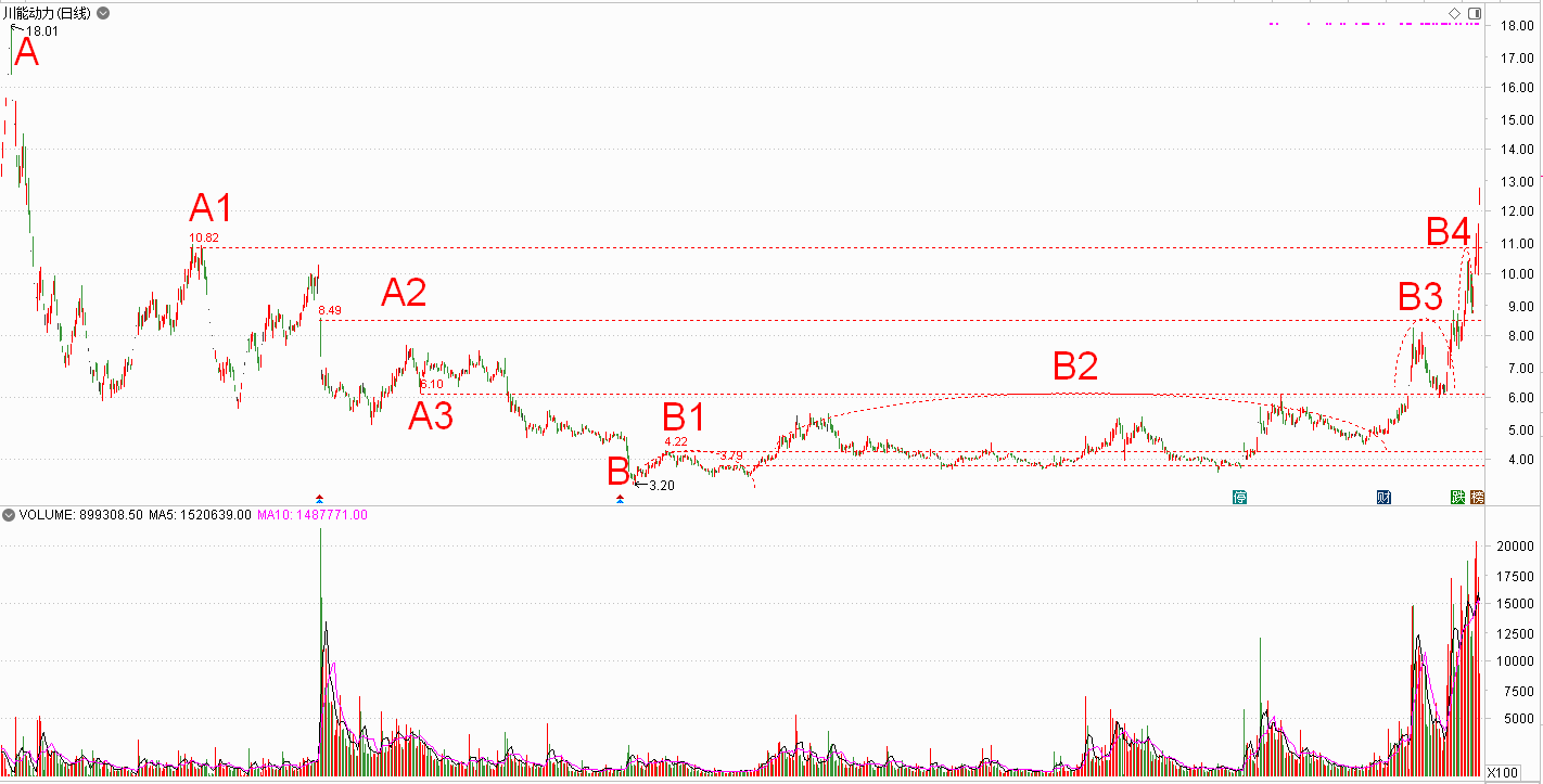 相比之下,川能动力目前好像要更胜一筹,它不但基本功扎实,而且还会使诈。从上图中我们可以看到,股价从A峰跌到B柱之后,先建立了一个B1筑底波,而后一连用B2、B3、B4三个接力波把股价推到A1峰附近,如果没有两下子功夫,要这样过五关斩六将地杀到这个位置,是很难很难的,但它做到了,所以说它的基本功还是不错的。