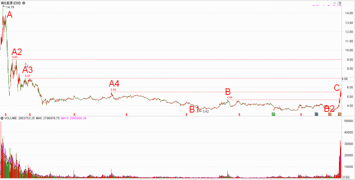 如果没办法提前预判怎么办?其实等待它突破再去关注也是可以的,因为主升浪的行情,突破6378才算启动,后面还有一倍左右或以上的理论空间,突破的位置对主升浪而言还是低位。比如我们视频上分析多次的湖北能源,就是这样!
