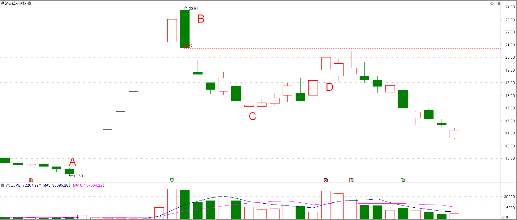 这样的分时出现之后,通常是股价阶段性的见顶标志,后面要是无法快速修复的话,一般就是一路下跌。例如刚才讲的世纪天鸿(见下图),B柱出现龙反水之后之后,股价就是连续大跌或跌停。C柱的时候虽然出现了拐点,股价也出现了一定幅度的上攻,但却无法突破B柱龙反水的实底,最终引发再一次的大跌。