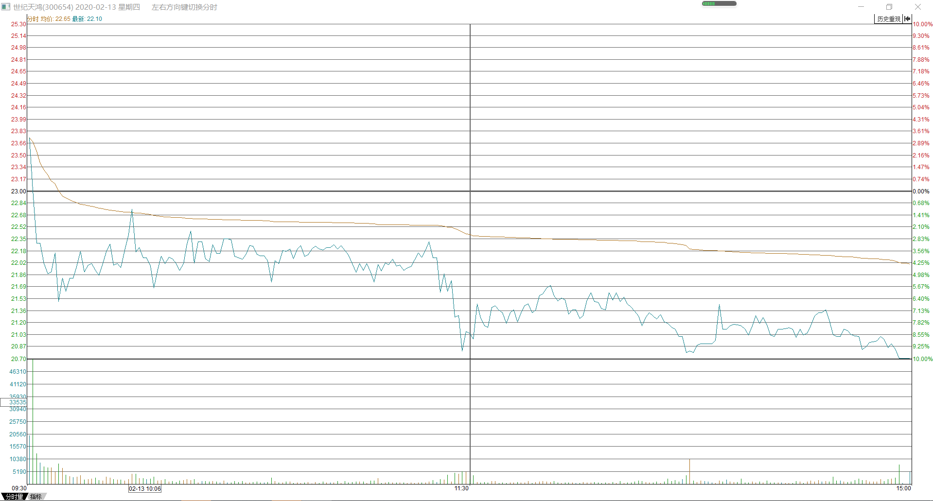 从上面300654世纪天鸿的分时图中我们可以看到,该股20200213这一天,股价高开之后曾瞬间上攻一下,随即就一头扎了下来,而后一路震荡向下,最后杀到跌停。这种走势,我们把它叫做龙反水或天河倒水。