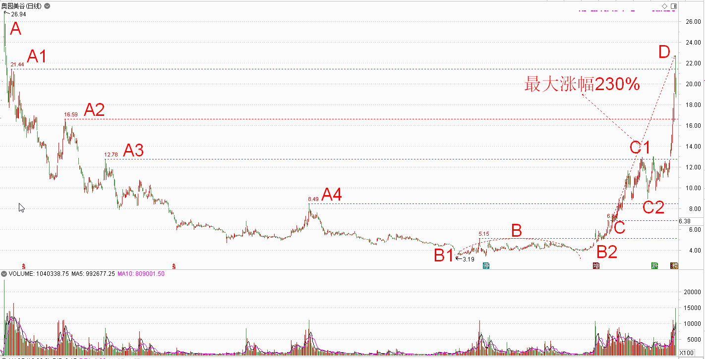 而结果,该股一如我们所判,虽然一直都震荡,但却一直在向上。如果从我们当初分析的收盘价算起,到D柱的开盘价止,最高涨幅达到230%。回首看去,天天进进出出的、夜夜梦想今天涨停明天也涨停的,一个个都出局了,只有坚定持有的,才笑到了最后,实现了翻倍甚至翻二倍的目标。
