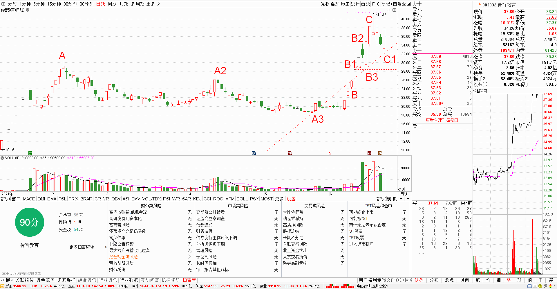 传智教育是本人0607直播视频上指出需要关注的两只鸿蒙次新之一(另一只是久联股份),也是我0610《一样的鸿蒙风,不一样的腾飞路》帖子里重点分析的三只龙头之一,在这之后,这股都出现了不同程度的大涨或上涨,如果我们以0607的收盘价作为起点计算,到B1冲高回落时为止,6天的时间里,最高涨幅达到了61.21%。