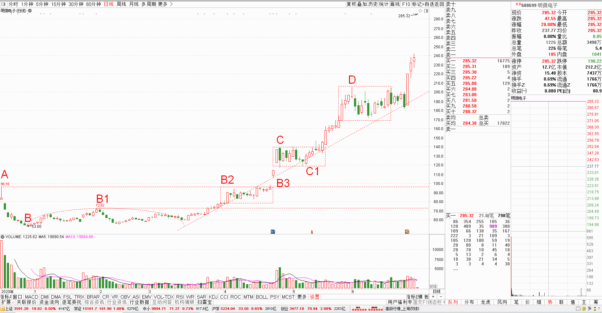具体到局部和微观方面,这股能够涨得这么好,还与B3的引爆板具有很强的关系,它的出现,至少说明3个问题:1、B3之下的筹码,都已被主力所控制,都是多头核心仓位。2、根据引爆板的性质,这股新的空间已被打开,后面将会出现主升浪行情。3、由于处于主升启动线上,它的支撑力会变得非常大。而从后面的走势看,这3点,都被一一验证。